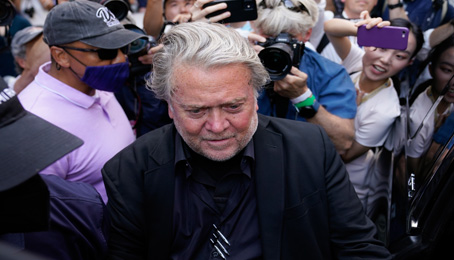 ▲ Steve Bannon fue declarado culpable ayer de dos cargos de desacato al Congreso, meses después de desafiar una citación del comité selecto de la Cámara de Representantes que investiga el asalto del 6 de enero de 2021 al Capitolio. El jurado de un tribunal federal de Washington concluyó que el ex asesor del ex presidente estadunidense Donald Trump debe responder a dos cargos: uno por negarse a comparecer a una declaración y otro por no proporcionar documentos. Bannon, de 68 años, conocerá la sentencia en octubre, la cual podría ir de un mes a un año de prisión por cada caso. Foto Ap. Agencias
