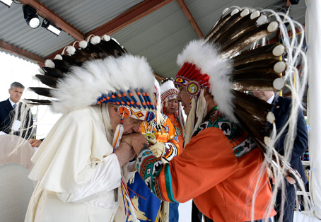 ▲ El pontífice emitió la histórica disculpa por la cooperación de la Iglesia católica, desde el siglo XIX, en la catastrófica política canadiense en internados indígenas. Subrayó que la integración forzada de los pueblos nativos a la sociedad cristiana destruyó sus culturas, separó a las familias y marginó a generaciones. Estoy profundamente dolido, dijo en un encuentro en Edmonton, Alberta, con sobrevivientes a los malos tratos. Cuatro jefes lo acompañaron y le colocaron un tocado de plumas. Foto Afp. Agencias