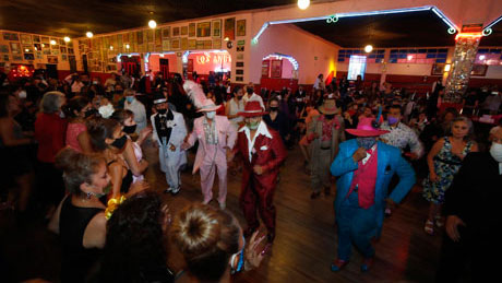 ▲ Más de mil personas se dieron cita el pasado martes para desear larga vida al emblemático lugar de la colonia Guerrero. Cuando el danzón se hacía presente, las parejas de inmediato se lanzaban a la pista para recrear los ritmos de antaño y siempre. Los pachucos no podían faltar y lucieron con la música de Felipe Urbán y su Danzonera, de Ramón Cedillo y su Big Bang y del conjunto África. El delirio llegó cuando las sonoras Dinamita y Santanera rubricaron el festejo. Foto Cristina Rodríguez. / Mónica Mateos-Vega