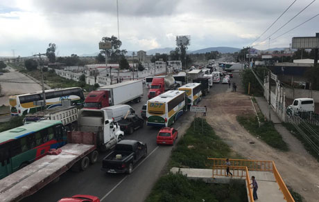 ▲ Habitantes de unidades y fraccionamientos de Tizayuca y municipios aledaños quedaron varados ayer durante ocho horas en la carretera federal y la autopista, sin posibilidad de llegar a sus centros laborales o escuelas, a causa del bloqueo realizado por choferes de camiones de pasajeros para denunciar la inseguridad que padecen a manos de grupos delictivos que los extorsionan, y por el asesinato de su compañero Juan Cirilo Rodríguez Romero, a quien el jueves por la noche hallaron con un tiro en la cabeza adentro de la unidad que manejaba. Foto La Jornada Hidalgo / Juan Ricardo Maontoya, corresponsal