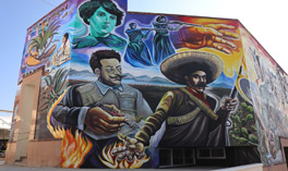 ◀ El mural Raíces de esperanza, rastros de nuestra historia fue plasmado en foro de San Salvador, Hidalgo, por alumnos de la escuela comunitaria Siqueiros. La obra es una mezcla de nuestro pasado indígena y las luchas nacionales. Foto La Jornada.