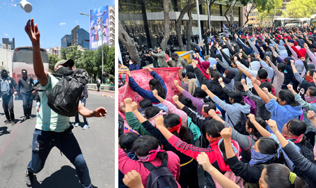 ▲ Armado de artefactos explosivos, piedras, resorteras, ladrillos y palos, un grupo de aproximadamente 20 jóvenes vandalizó el edificio de la FGR y agredió a los elementos de seguridad, quienes resultaron lesionados con esquirlas de petardos y sufrieron contusiones, lo que ameritó su traslado al hospital para su valoración médica, donde se encuentran fuera de peligro, informaron autoridades de la CDMX. Fotos Luis Castillo