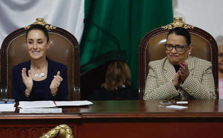 ▲ La titular de la Secretaría de Seguridad y Protección Ciudadana, Rosa Icela Rodríguez (derecha), acudió ayer en representación del presidente Andrés Manuel López Obrador al edifi cio de Donceles y Allende, donde la mandataria capitalina rindió su cuarto Informe. Afuera del recinto legislativo, cientos de simpatizantes madrugaron para ocupar un buen sitio tras las vallas instaladas a lo largo de la vialidad y manifestar su apoyo a la jefa de Gobierno, quien demoró casi 30 minutos en llegar al Congreso tras cruzar el acceso de Eje Central. Solícita, estrechó manos y posó para la foto con quien se lo pidió. Foto La Jornada