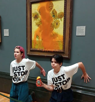 intactaluego de que dos ambientalistas burlaron la seguridad de la Galería Nacional de Londres e irrumpieron en la sala 43, donde se expone la pintura, y le arrojaron dos latas de tomate para exigir al gobierno británico poner fin a los nuevos proyectos de extracción de gas y petróleo. El cuadro pintado por el maestro impresionista holandés en 1888 está protegido con un cristal, por lo que sólo el marco resultó con afectaciones ligeras, informaron autoridades del museo. Tras el acto, los activistas se arrodillaron de espaldas a la obra y fijaron sus manos a la pared con pegamento.