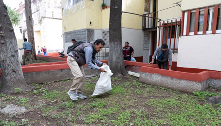 ▲ Por primera vez, personas en situación de calle participan en labores de limpieza, pintura y desyerbe de jardineras en vecindades, unidades habitacionales y vialidades del Centro Histórico de la Ciudad de México, con empleos temporales que les ofrece el Gobierno capitalino, en búsqueda de su inserción social.