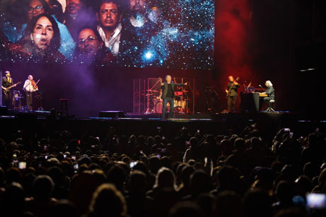 ▲ El cantautor catalán, de 78 años, interpretó éxitos como Mediterráneo, Cantares, Señora, Hoy puede ser un gran día, Penélope y Fiesta, entre otros temas, durante poco más de dos horas en el emblemático escenario del Centro Histórico de la CDMX ante unas 80 mil personas.