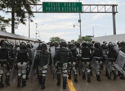 ▲ Con el propósito de contener la migración irregular y unir fuerzas para prevenir el tráfico de personas, efectivos de la Guardia Nacional de México y de la Policía Militar de Guatemala realizaron ayer un operativo, como en años anteriores, en el puente internacional Rodolfo Robles, que se ubica sobre el río Suchiate. El viceministro de Relaciones Exteriores guatemalteco, Geovani Castillo, negó que estas actividades se deban al arribo masivo de venezolanos. Foto Afp / Elio Henríquez, corresponsal