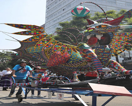 ▲ De las 11 de la mañana a las 3 de la tarde, más de 400 mil personas se dieron cita en el Centro Histórico de la Ciudad de México para ver el paso de las 160 formas y figuras de color fluorescente elaboradas por artesanos de la capital y los estados de México, Aguascalientes, Guerrero y Puebla, entre otros, las cuales partieron del Zócalo al Ángel de la Independencia. Las obras se quedan en exhibición sobre Reforma hasta el 13 de noviembre; los ganadores del concurso se darán a conocer el 29 de este mes. Entre los que más llamaron la atención se encuentran Nahual de los cuatro elementos, Tlatoani y Delirio. Foto Yazmín Ortega Cortés. Elba Mónica Bravo