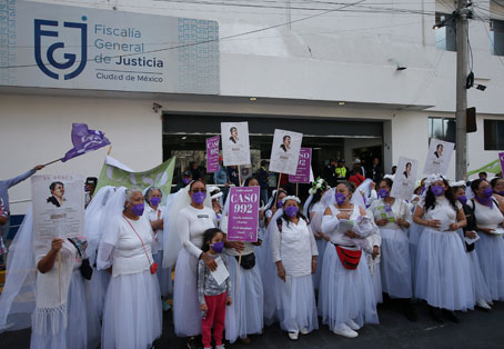 ▲ Integrantes de la iniciativa caso 992 se vistieron de novias frente a la Fiscalía General de Justicia capitalina para solicitar que se localice a quienes no cubren la pensión alimentaria de sus hijos. Asimismo, penalizar la llamada violencia vicaria, en la cual progenitores lastiman física o sicológicamente a algún vástago para causar dolor a la madre. Denunciaron el asunto del ex servidor público Leonel Ramírez Farías, quien en 2016 agredió a sus hijos y despojó de sus bienes a su ahora ex esposa. Foto Alfredo Domínguez. Laura Gómez Flores