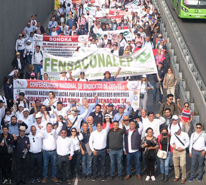 ▲ Miles de integrantes de sindicatos de instituciones como el Conalep, el Colegio de Bachilleres, los Cecyt y el Telebachillerato Comunitario marcharon a la Cámara de Diputados para demandar aumento de recursos y respeto a derechos laborales. Aseguran que hay un adeudo de 3 mil millones de pesos. Una comisión de legisladores acordó atender peticiones. Foto José Antonio López. / Fernando Camacho