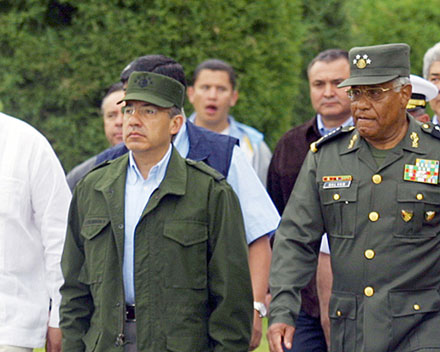 ▲ El entonces mandatario Felipe Calderón arriba a la 43 zona militar ubicada en Apatzingán, Michoacán, en enero de 2007. En la parte de atrás lo acompaña Genaro García Luna, quien fungía como secretario de Seguridad Pública. Foto La Jornada Michoacán