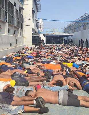 ▲ Internos de la Penitenciaría del Litoral, en el puerto de Guayaquil, permanecen boca abajo luego del ingreso de cientos de policías y militares tras una nueva revuelta para evitar el traslado de 417 presos, incluidos cabecillas. Los reclusos habían recibido con disparos y granadas a las fuerzas del orden e hirieron a 15 uniformados. La ciudad se mantiene en estado de excepción a raíz de una ola de violencia del narcotráfico. Foto Europa Press. / Agencias