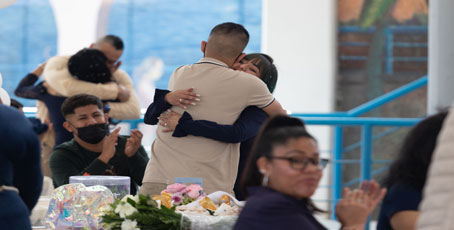 ▲ De 14 parejas que se unieron ayer en matrimonio, 10 consolidaron su amor en reclusión, aunque físicamente seguirán separadas por purgar sus penas en diferentes centros de readaptación social de la Ciudad de México. Además de las bodas, se realizaron dos registros de nacimiento de adultos y cinco reconocimientos de hijos de mujeres que se hallan privadas de la libertad. Desde muy temprano, familiares de los novios llegaron al banquete, el cual incluyó pastel. Entre las uniones que se hicieron oficiales está la de dos mujeres de la comunidad LGBT+ de Santa Martha. Foto Pablo Ramos. Josefina Quintero M.