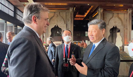 es inadmisible. El presidente de China, Xi Jinping, quien charla en la imagen con el canciller Marcelo Ebrard, expresó su oposición a que se usen cereales y energéticos como mecanismos de presión. Foto SRE. / Agencias