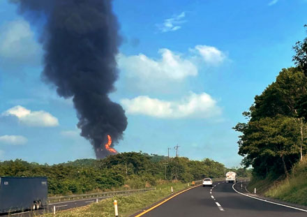 ▲ La explosión ocurrió durante las maniobras para controlar una fuga de gas etano en un ducto que corre a un costado de la carretera Costera del Golfo, tramo Coatzacoalcos-Villahermosa, cerca del ejido Miguel Alemán, municipio de Agua Dulce, informó la Secretaría de Protección Civil local. Los lesionados fueron trasladados a hospitales de la empresa estatal. Al cierre de la edición, el incendio seguía activo, al tiempo que se aplicaron en la zona el Plan DNIII-E y el Plan Marina. Foto La Jornada. / Sayda Chiñas / La Jornada Veracruz