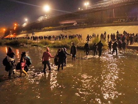 ▲ Unos mil 200 extranjeros cruzaron masivamente el río Bravo y formaron una gran hilera frente al muro fronterizo estadunidense, entre la noche del domingo y el lunes, después de llegar en caravana a Ciudad Juárez, Chihuahua. Los indocumentados, principalmente de Nicaragua, arribaron en 19 autobuses, descansaron en los albergues para luego continuar su trayecto hacia el bordo del embalse para pedir refugio, informaron encargados de derechos humanos. Foto Afp. Jesús Estrada y Rubén Villalpando, Corresponsales