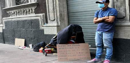 ▲ Mientras resuelven la forma en que continuarán la travesía hacia Estados Unidos, migrantes que habitan en refugios temporales de la capital del país solicitan apoyo económico a los transeúntes en las calles 5 de Mayo, 16 de Septiembre y Madero, donde permanecen de pie o sentados en la banqueta junto con sus familiares y sus pertenencias. Foto E. Bravo. Elba Mónica Bravo