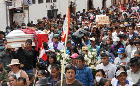 ▲ Fuerzas del orden reprimieron ayer protestas en Ayacucho, epicentro de la crisis política que ha dejado 23 muertos tras la destitución del presidente Pedro Castillo, al tiempo que agentes irrumpían en instalaciones de la Confederación Campesina y de los partidos Nuevo Perú y Socialista. Los gobiernos de Colombia, Chile y Ecuador exigen respeto a los derechos humanos en la nación andina . En la imagen, funeral de Clemer Rojas García, de 23 años. Foto Ap. Agencias
