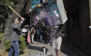 ▲ Vecinos afectados por el llamado cártel inmobiliario en la alcaldía Benito Juárez celebraron una antiposada frente a la sede del PAN, donde rompieron una piñata en forma de edificio. Exigieron que se aplique la ley a los diputados Jorge Romero y Luis Mendoza, así como a Santiago Taboada por el aval a obras irregulares. Foto La Jornada. S. Hernández