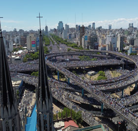 ▲ Las principales arterias de la capital argentina colapsaron por la multitud que se congregó para celebrar el paso del autobús que transportaba a los campeones de la Copa del Mundo de Qatar, rumbo al emblemático Obelisco. La marea humana impidió acabar el trayecto. La unidad fue desviada a un lugar despejado, donde Lionel Messi y sus compañeros fueron movilizados en helicópteros. Foto Xinhua. / S. Calloni