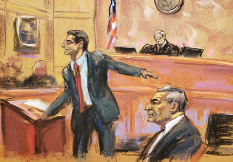 ▲ El juicio contra Genaro García Luna, quien fuera secretario de Seguridad Pública en el sexenio de Felipe Calderón, comenzó ayer en NY. En la imagen se ve al imputado, mientras el fiscal Phillip Pilmar lo acusa. Al fondo, el juez Biran Cogan. Ilustración de Jane Rosenberg