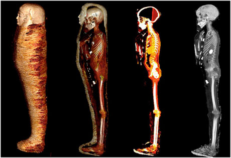 ▲ Tomografías computarizadas permitieron ver el cuerpo de un adolescente egipcio de alto nivel socioeconómico, el cual portaba 49 amuletos de 21 tipos para promover su resurrección, muchos de ellos de oro, los cuales fueron colocados cuidadosamente sobre su piel o en el interior, como un escarabajo en forma de corazón puesto dentro de su cavidad torácica. Foto Ap / Europa Press