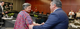 ▲ El dirigente del PRI saluda a Beatriz Paredes tras irrumpir en el Senado. La mayoría de legisladores del tricolor le hicieron vacío y abandonaron la reunión plenaria. Foto La Jornada