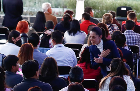 ▲ Claudia Sheinbaum, jefa de Gobierno capitalina; Leticia Ramírez, secretaria de Educación Pública, y Alfa González, alcaldesa en Tlalpan, encabezaron el encuentro con los deudos de los 19 niños y siete adultos que murieron por el colapso del colegio en el sismo de septiembre de 2017, por anomalías en su edificación. Las autoridades de la CDMX pusieron en operación una plataforma digital en la que se puede conocer la situación de las 2 mil 938 escuelas privadas en materia de protección civil y uso de suelo. Foto Víctor Camacho. A. Cruz