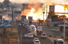 ◀ Dos muertos y cuatro heridos dejó el estallido del vehículo perteneciente a una firma privada cuando cargaba combustible, además de 10 automóviles, dos tiendas y ocho estaciones de bomba calcinados. Mientras, en Guanajuato, una pipa se quemó cuando sustraía de forma ilegal combustible de un ducto de Pemex, lo que provocó el cierre de la carretera León-Silao. Foto tomada de video