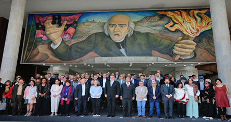 ▲ Las delegaciones encabezadas por Pablo Beltrán, comandante de la guerrilla del Ejército de Liberación Nacional, y Otty Patiño, jefe de la representación del gobierno de Gustavo Petro, comenzaron ayer el segundo ciclo de diálogos que se realiza en la CDMX, en la sede de la Conferencia Interamericana de Seguridad Social. Las negociaciones son acompañadas por Brasil, Chile, Cuba, México, Noruega y Venezuela, como países garantes. El canciller Marcelo Ebrard participó en ese acto. Foto María Luisa Severiano. Emir Olivares