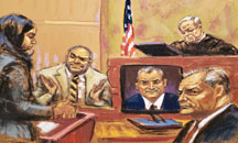 ▲ Interrogatorio de Jesús El Rey Zambada. Genaro García Luna aparece a la derecha. Ilustración de Jane Rosenberg