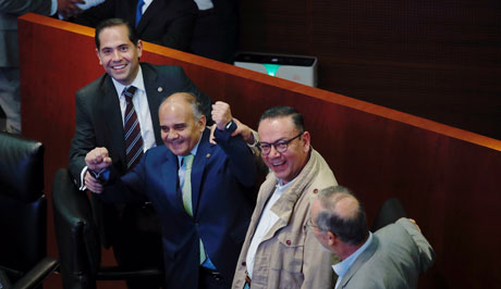 El nuevo coordinador del grupo parlamentario del PRI en el Senado fue felicitado por Raúl Bolaños (PVEM), Germán Martínez y Gustavo Madero (Grupo Plural). El ex secretario de Gobernación, quien no acudió ayer a la sesión, recibió el reconocimiento de la mayoría de fuerzas políticas por su desempeño camaral durante cuatro años y medio. En la bancada tricolor se vive tensión ante la posibilidad de que otros legisladores decidan abandonar sus filas. Foto Cristina Rodríguez.  / Andrea Bacerril y Georgina Saldierna