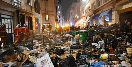 ▲ Bomberos apagan en París un incendio en la basura durante las manifestaciones de rechazo a la reforma pensionaria del gobierno de Emmanuel Macron. Toneladas de desperdicios se han acumulado en urbes de Francia por el paro de trabajadores de limpia. Foto Afp