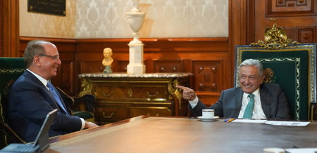 ▲ El presidente Andrés Manuel López Obrador recibió en Palacio Nacional a Larry Fink, director de BlackRock, el fondo de inversiones más importante del mundo. Es la segunda ocasión que el empresario se reúne con el mandatario. La primera se dio el año pasado, en la que el visitante aseguró que México es un gran lugar para atraer capitales. Foto Presidencia