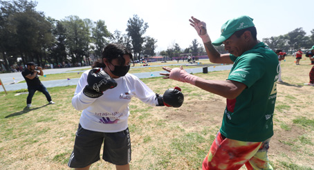 ▲ Personas preliberadas y afiliadas al Instituto de Reinserción Social acuden al deportivo Meyehualco, no sólo a sellar su carnet y mostrar que acatan las medidas fijadas por un juez para seguir su proceso fuera de prisión, sino a practicar un deporte. Arturo Morell, director del organismo, expuso que la estrategia es ofrecer actividades de capacitación laboral y de salud física. La recreación incluye futbol, boxeo, atletismo, acondicionamiento físico, zumba y tochito bandera. Foto Luis Castillo. Laura Gómez
