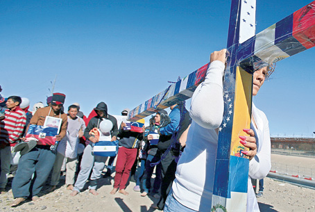 ▲ Migrantes y colectivos de Ciudad Juárez, Chihuahua, realizaron el llamado Viacrucis ponte en mis zapatos, una marcha con los pies descalzos cerca del río Bravo, donde se alza el muro fronterizo. El objetivo, señalaron, es crear conciencia entre los gobiernos y los ciudadanos de México y Estados Unidos de lo que significa buscar un refugio fuera de sus países de origen. Foto Ap