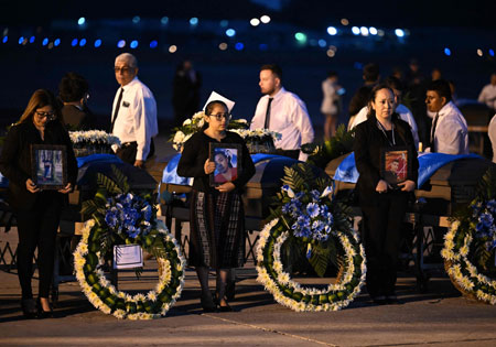 ▲ Dos aviones de la Fuerza Aérea Mexicana trasladaron ayer a sus países de origen, los cadáveres de 17 migrantes de Guatemala (imagen) y seis de Honduras, quienes perecieron en el incendio de una estación del INM en Ciudad Juárez, Chihuahua, el 27 de marzo. Familiares de las víctimas y autoridades viajaron en las naves. Foto Afp. / Corresponsales, Arturo Sánchez y Redacción