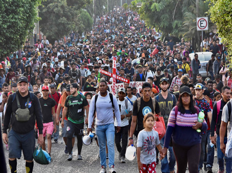 ▲ La caravana de migrantes de Venezuela, Honduras y El Salvador, principalmente, con una cruz de madera al frente, recorrió ayer 14 kilómetros de Tapachula, Chiapas, a la localidad de Álvaro Obregón, donde pernoctaron. Foto Afp