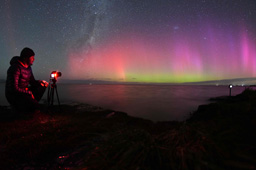 ◀ El cielo en el norte y el sur del planeta se iluminó de auroras boreales y australes debido a la explosión de material supercaliente del astro rey el fin de semana, que arrojó gases a casi 3 millones de kilómetros por hora. La imagen es en el lago Ellesmere, Nueva Zelanda. Foto Afp.