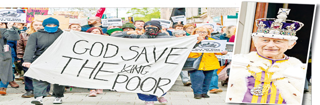 ▲ Opositores a la monarquía se manifestaron en la plaza Trafalgar mientras miles pernoctaron para ver el desfile. En la manta se lee: Dios salve a los pobres. Fotos Afp y Ap