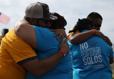▲ Después de años de no verse, ciudadanos mexicoestadunidenses cruzaron la frontera durante seis minutos para rencontrarse con sus parientes en la ribera del río Bravo donde termina Texas y empieza la ciudad de Sunland Park, Nuevo México. Las nueve ediciones anteriores del acto de amor y protesta que organiza la Red Fronteriza por los derechos Humanos se realizaron entre Ciudad Juárez y El Paso, pero este año se cambió debido al alambre de púas que militares de Estados Unidos colocaron a lo largo del cauce y por la presencia de grupos de migrantes que intentan pedir asilo. Foto Afp / Rubén Villalpando y Jesús Estrada, corresponsales