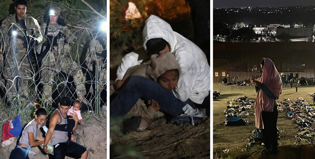 ▲ Migrantes provenientes de Matamoros, Tamaulipas (izquierda), intentaron ingresar a Estados Unidos, hasta casi la medianoche, pero se toparon con cercas con alambres de púas y agentes de la Guardia Nacional texana, que los disuadieron. Lo mismo ocurrió en el cruce de Ciudad Juárez y El Paso (centro), donde cientos de extranjeros esperaron en vano ser asistidos. En la frontera Tijuana-San Diego acamparon entre los muros que separan a las dos naciones. Fotos Ap y Mireya Cuéllar / La Jornada Baja California