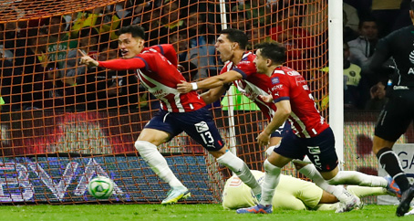 ▲ Con marcador de 3-1 en el estadio Azteca (global 3-2), el Guadalajara logró su pase para disputar el cetro del torneo Clausura 2023 ante Tigres. La sentencia del técnico Veljko Paunovic de este equipo puede ganarle a cualquiera se cumplió con goles de Ronaldo Cisneros (19), Alan Mozo (76) y Jesús Orozco (88, en la imagen). El español Álvaro Fidalgo se fue expulsado minutos después de la igualada 1-1 conseguida por Diego Valdés (57). El timonel de las Águilas, Fernando Ortiz, renunció. Foto Víctor Camacho. Alberto Aceves