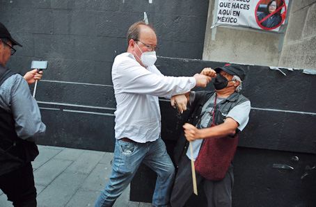 ▲ Participante en la marcha convocada en apoyo de la SCJN se lanzó contra una de las personas que permanecían en plantón desde hace meses en la puerta del máximo tribunal, en demanda de la renuncia de la ministra Norma Lucía Piña. Al grito de