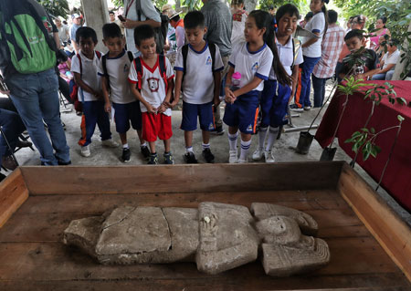 ▲ El hallazgo de una segunda escultura en el municipio veracruzano Álamo Temapache en poco más de dos años muestra, según datos preliminares, que se trata de una gobernante huasteca entre los años 1100 y 1200 de nuestra era (Posclásico temprano). También echa por tierra que la figura tenga elementos de la cultura mexica, como se determinó cuando fue encontrado el primer monolito, señaló la arqueóloga María Eugenia Maldonado. La pieza fue expuesta en la comunidad Hidalgo Amajac. Foto Marco Peláez. / Ángel Vargas