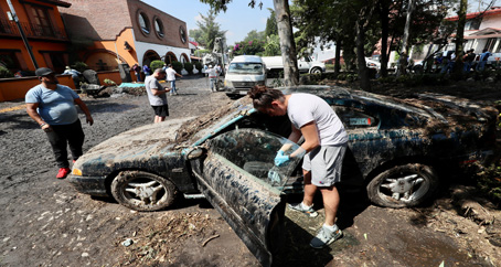 ▲ Al menos 108 casas inundadas, más de 60 vehículos dañados y afectaciones aún no cuantificadas dejó el desbordamiento de los ríos Chiquito, Hondo y los Remedios en el municipio mexiquense, debido a la tormenta de la noche del miércoles y por la acumulación de basura en los drenajes. La alcaldesa Angélica Moya señaló que se elabora un censo para dar ayuda. En la imagen, habitantes de la unidad Los Alcanfores realizan labores de limpieza en sus bienes. Foto Roberto García Ortiz. Silvia Chávez, Corresponsal