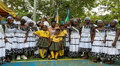 ▲ La vicepresidenta (al centro, rodeada de niñas) arribó con una comitiva para poner en marcha planes sociales en la región de Atrato medio, en el empobrecido departamento del Chocó, al noroeste de Colombia, donde prevalece la población negra e indígena. En La Loma inauguró el Instituto Colombiano Agropecuario, que cubrirá desde jardín de niños hasta carreras técnicas. En la zona todavía quedan grupos activos del ELN, un núcleo disidente de las FARC y facciones paramilitares. Foto vicepresidencia de Colombia