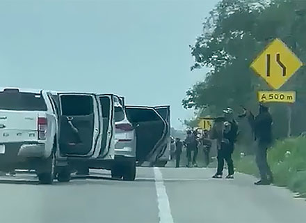 ▲ Hombres armados a bordo de dos vehículos interceptaron un camión en el que viajaban los trabajadores administrativos de esa dependencia. El levantón se cometió en la tarde en las inmediaciones del cruce Llano San Juan, en la carretera Ocozocoautla-Tuxtla Gutiérrez. La Fiscalía General del Estado puso en marcha un gran operativo para localizar a las víctimas, pero al cierre de esta edición seguían desaparecidas. Foto tomada de un video difundido en redes sociales. / De la Redacción