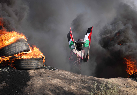 ▲ Participación de un palestino en las protestas contra Israel en la franja de Gaza. El ejército de Tel Aviv detuvo a 70 personas en Jenin, en Cisjordania reocupada, durante una