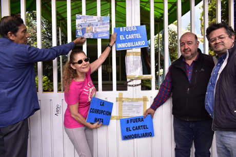 ▲ Vecinos de la alcaldía Benito Juárez desplegaron cartelones frente al inmueble, con valor de 58 millones de pesos, ubicado en José María Rico 617, colonia Del Valle, cuya propiedad, afirmaron, está a nombre de Noelia Romero Herrera, hermana del diputado panista. El predio, que albergaba un colegio, tiene sellos de la Fiscalía General de Justicia que indican que está asegurado por el delito de enriquecimiento ilícito. Es muestra del nepotismo criminal del cártel inmobiliario, expusieron. Foto La Jornada. / Sandra Hernández